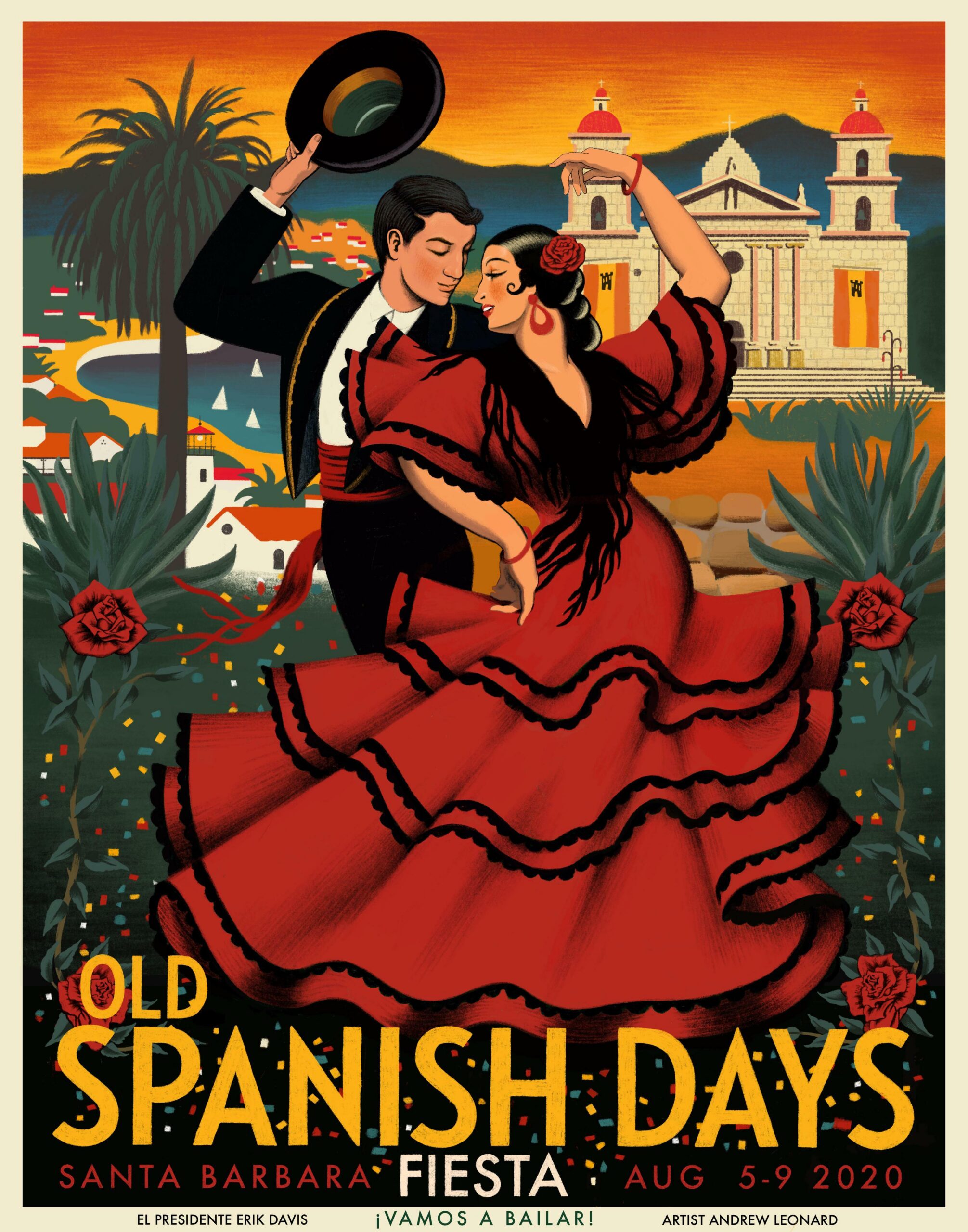 The 2020 Fiesta poster is an original graphic designs by local Santa Barbara artist Andrew Leonard. The poster captures iconic scenes of Santa Barbara like the Santa Barbara Mission and the waterfront and prominently features a dancing couple. The couple depicted were inspired by famous posters from Seville, Spain and are evocative of this year’s Fiesta Theme,“¡Vamos a Bailar!”, in English, “Let’s Dance!”.