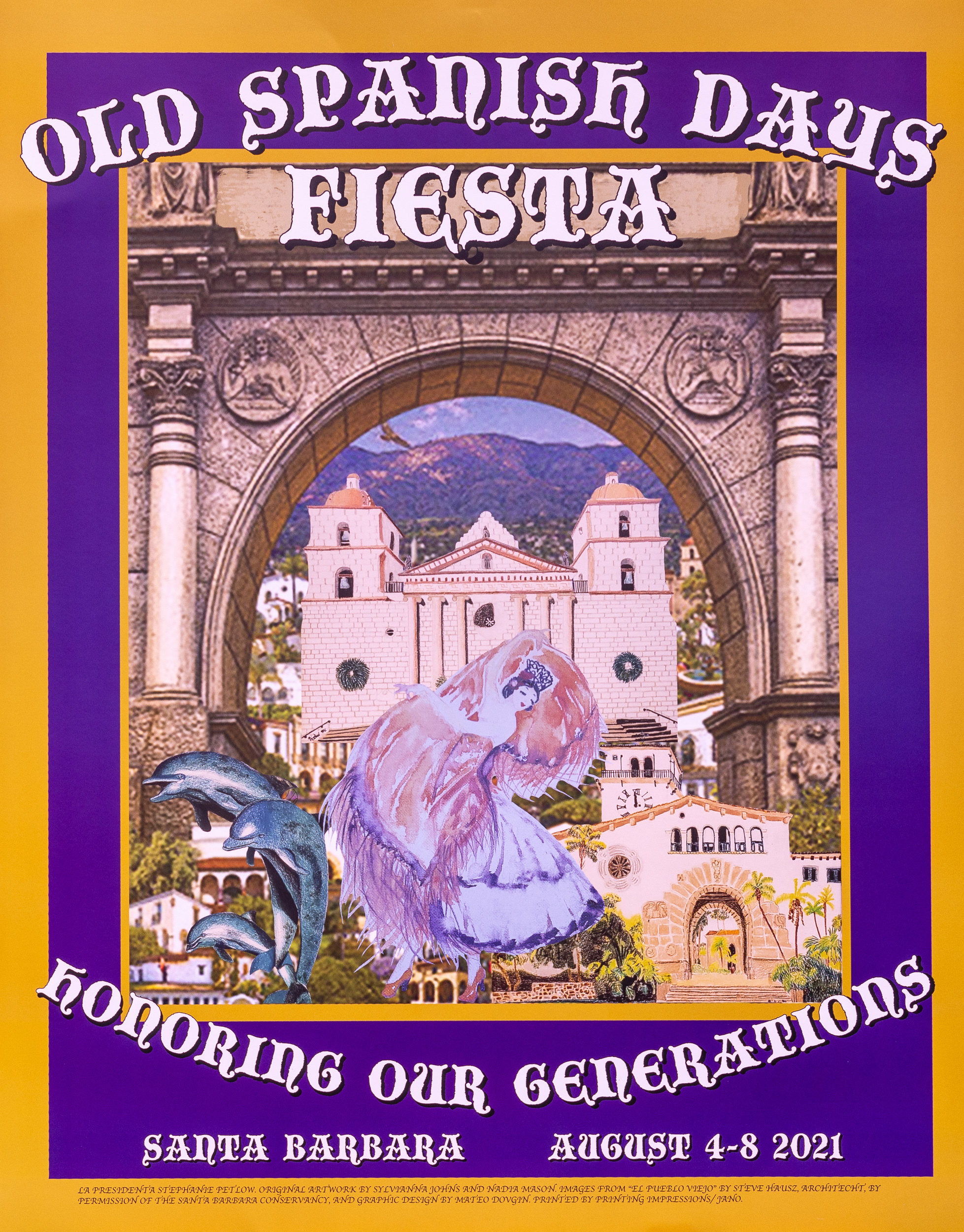 The inspiration for the 2021 poster began with a watercolor by Sylvianna Johns, a New Mexico fine artist, and the mother of La Presidenta 2021 Stephanie Petlow. Ms. Petlow’s granddaughter Nadia Mason then added colored pencil drawings of iconic Santa Barbara landmarks for the poster including the Santa Barbara County Courthouse, the Old Mission Santa Barbara and local artist Bud Bottoms’ Dolphin Family sculpture known as the‘Bicentennial Friendship Fountain’ at State Street and Cabrillo Boulevard.