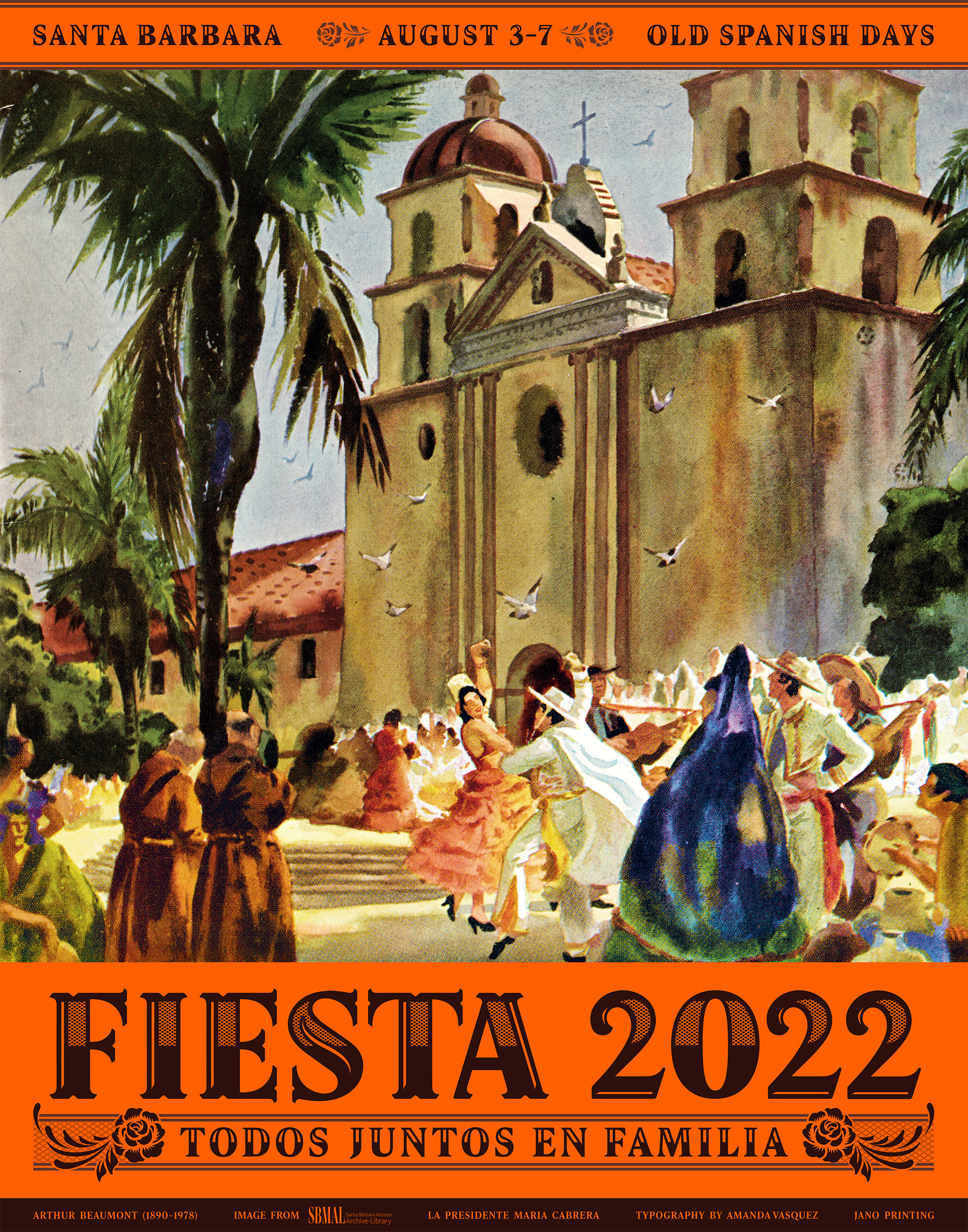 The poster is a joyful scene painted in lively colors depicting a celebration of music and dance in front of Old Mission Santa Barbara. La Presidente 2022 Maria Cabrera stumbled across the watercolor by Arthur Beaumont while archiving Fiesta material in the Old Mission Archive library.