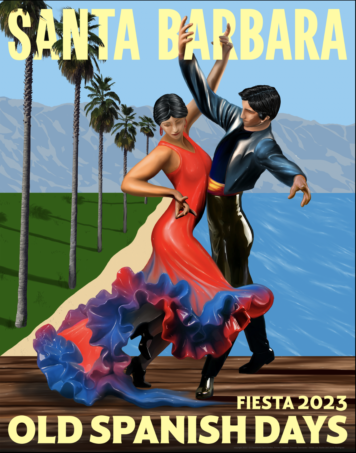 Since 1924, the annual Fiesta poster is a symbol of that year’s annual community celebration. It is the culmination of a vision and style spearheaded by the year’s head of the now 99-year-old organization, the “El Presidente”. “Figuring out a way to combine dance, vitality and our city’s beauty was the goal in creating this year’s Fiesta poster,” said 2023 El Presidente David Bolton. “It was nearly a year-long effort, and in the end, it has everything I had hoped for and I hope that the community likes it too.”