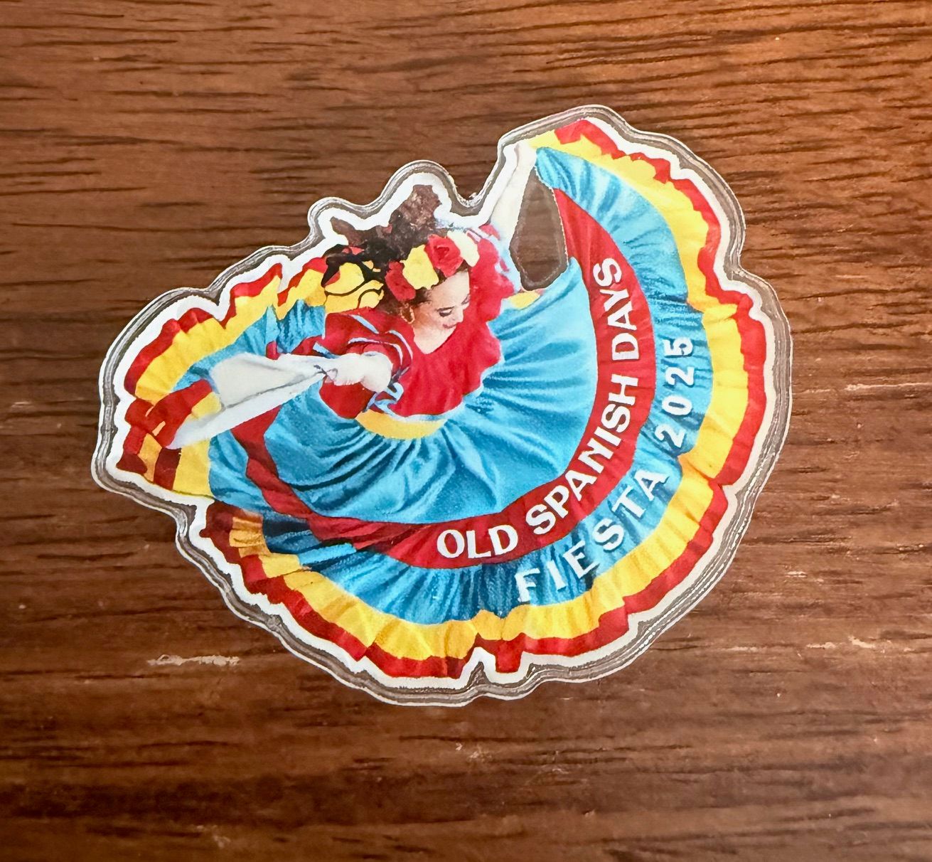 Like the 2025 poster and pin, this year’s official Fiesta magnet is inspired by the photography of 2025 El Presidente Fritz Olenberger. For over a decade, Fritz has captured dancers in motion from the rooftop of the Old Mission. After reviewing over 10 years of such photos, one vibrant photograph was chosen and artistically adapted into this year’s collectible pin and magnet.